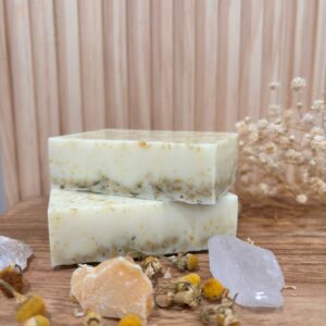 Immerse your Skin in Calm and Nourishment with our Gentle Soap! Crafted from a soothing goat milk base, calming chamomile, and nourishing jojoba oil. enhanced with vitamin E, it helps reduce redness, soothes irritation, and deeply hydrates, leaving your skin feeling refreshed, balanced, and radiant.